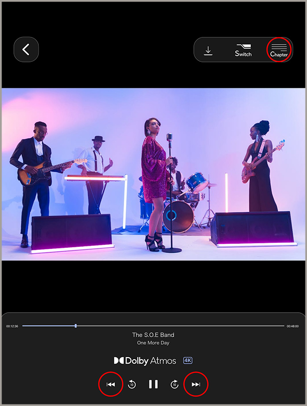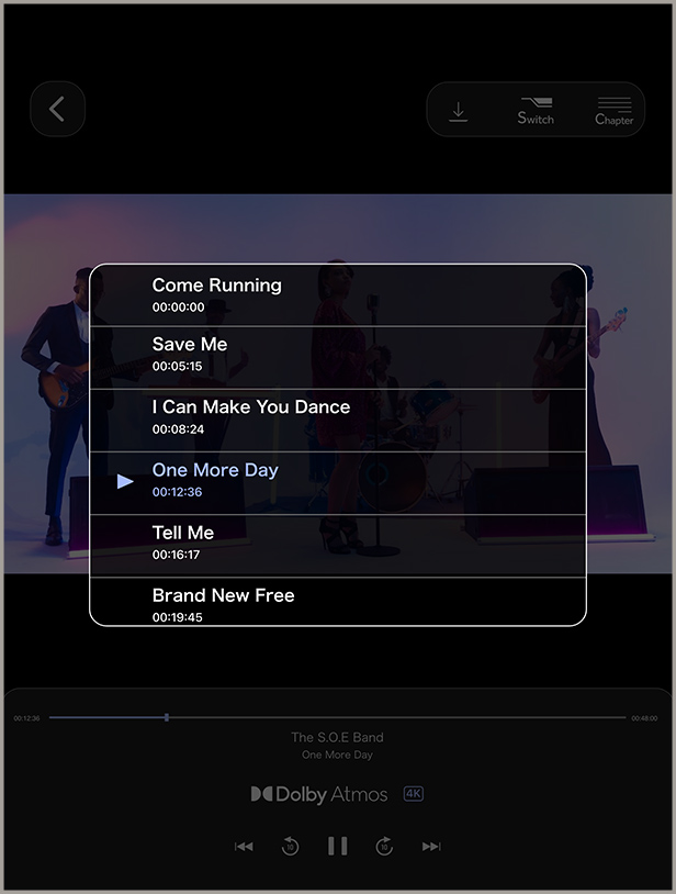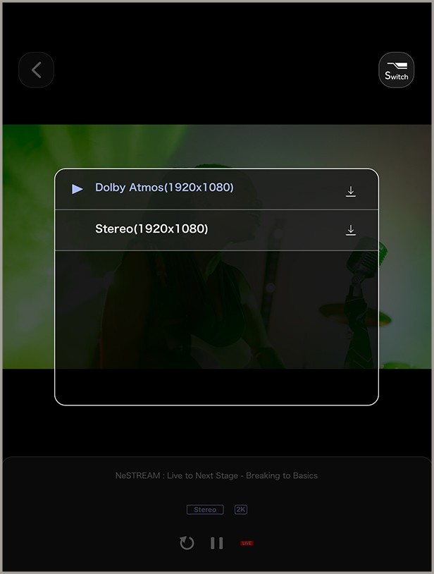 その場合、再生コントロールのSwitchアイコンよりDolby Atmos以外の配信(Stereoなど)でご視聴いただけます。(Dolby Atmosサンプルムービーは、対応機器かの確認のためDolby Atmos音声のみ配信されております。) -